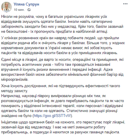 "В клиниках развитых стран вы вряд увидите людей, пришедших навестить родственника или ожидающих врача в бахилах. Более того, в нормативных документах в Украине нет требований, которые обязывают пациентов и посетителей носить бахилы во всех помещениях больниц", - сообщила Супрун.