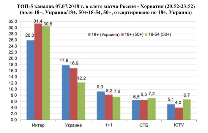 Абсолютным лидером просмотра на нынешнем чемпионате стал матч Россия – Хорватия: доля поединка по аудитории 18+ составила 26% по всей Украине и 31,4% в городах 50 тыс.+. По целевой аудитории 18-54 в крупных городах матч собрал долю 30,6%, оторвавшись от ближайшего конкурента более чем в два раза. Этот футбольный поединок – лидер не только среди матчей ЧМ-2018, он также побил рекорд телесмотрения футбольных поединков ЧМ-2014!