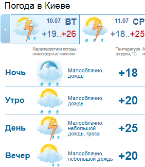 Ресурс gismeteo.ua уточняет, что днем в Киеве малооблачно, небольшой дождь. Температура +20...+25.