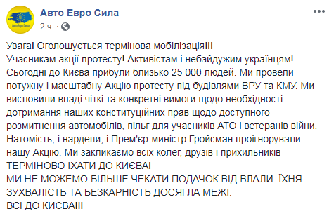 "Внимание! Объявляется срочная мобилизация! Участникам акции протеста! Активистам и неравнодушным украинцам! Сегодня в Киев прибыли около 25 тысяч человек. Мы провели мощную и масштабную Акцию протеста под зданиями ВРУ и КМУ. Мы выразили власти четкие и конкретные требования о необходимости соблюдения наших конституционных прав относительно доступной растаможки автомобилей, льгот для участников АТО и ветеранов войны. Однако и нардепы, и премьер-министр Гройсман проигнорировали нашу Акции. Мы призываем всех коллег, друзей и сторонников срочно ехать в Киев! Мы не можем больше ждать подачек от власти! Их дерзость и безнаказанность достигла предела!" - говорится в сообщении.