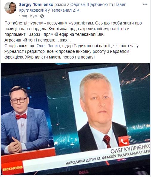 Народный депутат, член Радикальной партии, Олег Куприенко в прямом эфире на телеканале ZIK предложил главному редактору "РБК-Украина" Сергею Щербине "засунуть "пурген" куда-нибудь". Данные слова прозвучали, когда Куприенко комментировал инициативу об ограничении для журналистов доступа к кулуарам Рады.