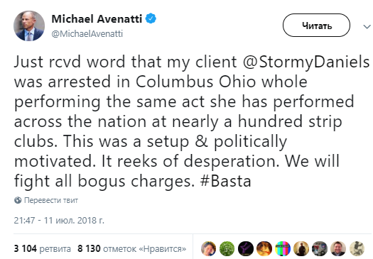 Об аресте своей подзащитной сообщил адвокат Майкл Авенатти в своем микроблоге в Тwitter.