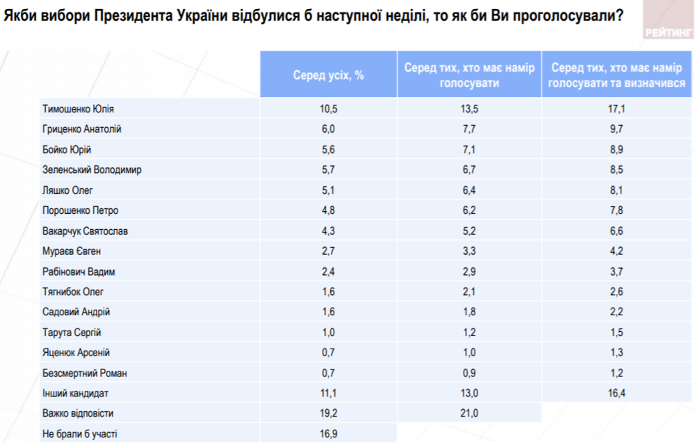 Среди тех, кто намерен голосовать, Тимошенко готовы поддержать 13,5% опрошенных, Гриценко - 7,7%, а Бойко 7,1%.
