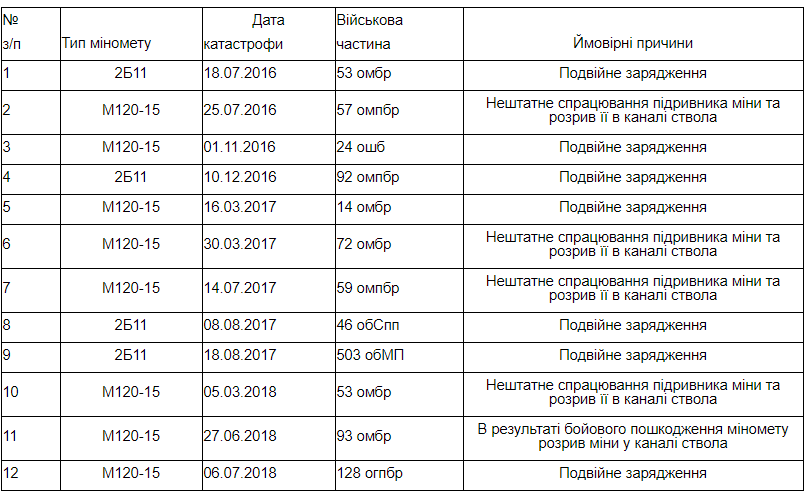 Согласно обнародованной информации, за последние два года при эксплуатации 120-милимметровых минометов М120-15 "Молот" и минометов советского производства 2Б11, зафиксировано 12 случаев нештатных ситуаций.