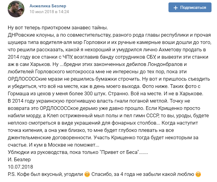 На одном из фото – цеха завода, подписанного как Горловский машиностроительный завод. В посте упоминается, что "глава ДНР" Александр Захарченко и "мэр" Горловки Иван Приходько обвинили Безлера в продаже станков в 2014 году миллиардеру Ринату Ахметову.