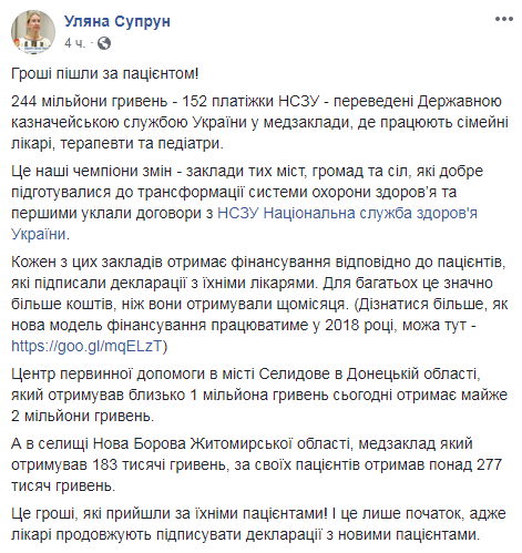 Государственная казначейская служба Украины перевела 244 миллиона гривен в медучреждения, которые перешли на семейных врачей, терапевтов и педиатров. Об этом сообщила и.о. министра здравоохранения Ульяна Супрун на своей странице в Facebook.