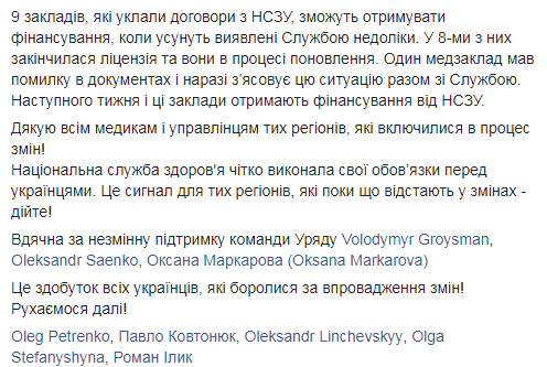 Национальная служба здоровья четко выполнила свои обязанности перед украинцами. Это сигнал для тех регионов, которые пока отстают в изменениях - действуйте!", - отметила она.