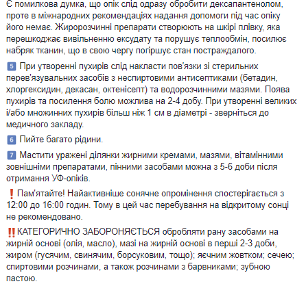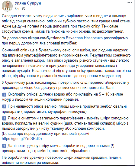 Глава минздрава Уляна Супрун дала советы правильного лечения солнечных ожогов. Она отметила бесполезность сметаны, масел, зубной пасты, кремов, мазей и пенок на жирной основе, а также дексопантенола. Особенно в первые пару дней после ожога.