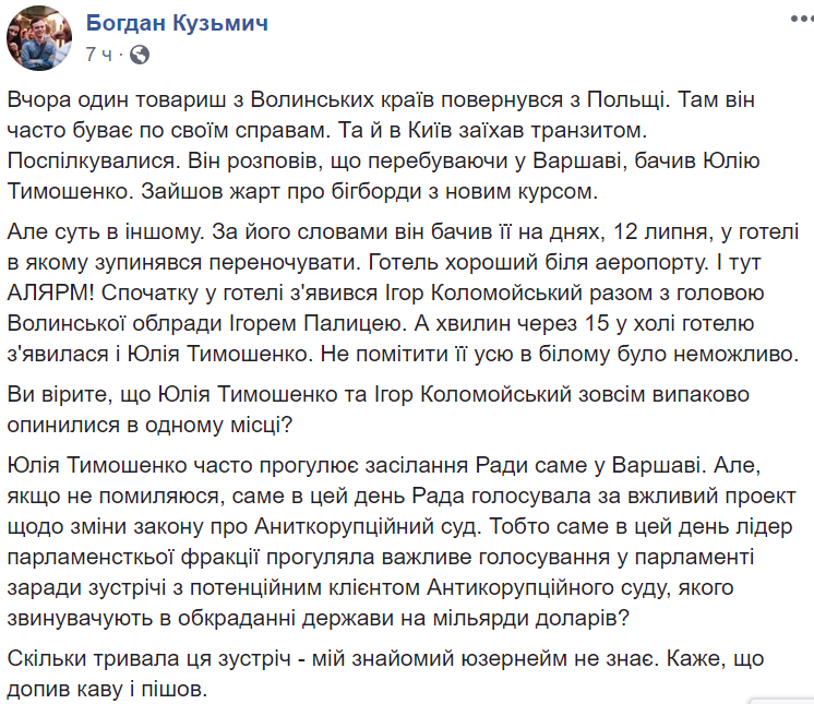 "Сначала в гостинице появился Игорь Коломойский вместе с председателем Волынского облсовета Игорем Палицей. А минут через 15 в холле гостиницы появилась и Юлия Тимошенко. Не заметить ее всю в белом было невозможно", - написал Кузьмич у себя в Facebook.