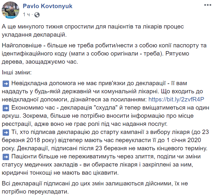 • те, кто подписал декларацию до старта кампании по выбору врача (до 23 марта 2018) отныне имеют время перезаключить ее до 1 января 2020 года. Декларации, подписанные после 23 марта, не имеют конечного срока;