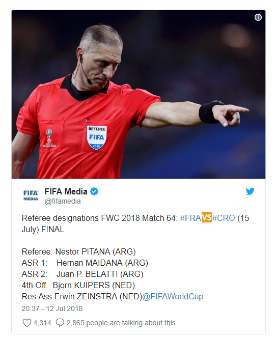15:12 Главным судьей финального матча Мундиаля между командами Франции и Хорватии в Москве станет Нестор Питана из Аргентины, помощниками ему будут Эрнан Майдана и Хуан Белатти.