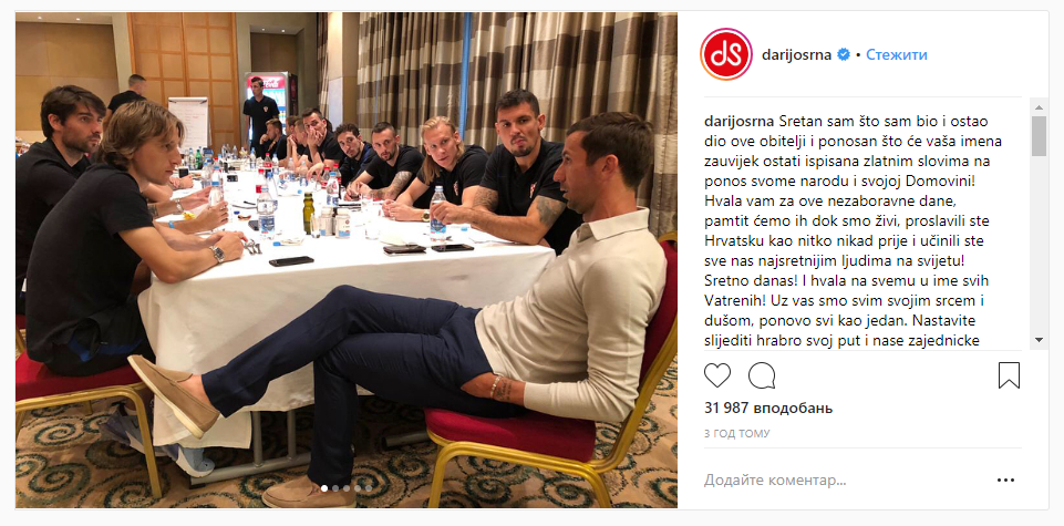 Желаю удачи в сегодняшнем матче! И говорю спасибо от имени всех игроков сборной. Мы все пребываем вместе с вами и душой и сердцем как один. Идите своей дорогой и воплощайте общую мечту! Поверьте, вы величайшие и единственные победители в наших сердцах! Лучшие из лучших!" - написал Срна.