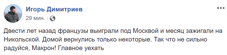 20:13  "Двести лет назад французы выиграли под Москвой и месяц зажигали на Никольской. Домой вернулись только некоторые. Так что не сильно радуйся, Макрон! Главное уехать", - пишет одессит Игорь Димитриев.