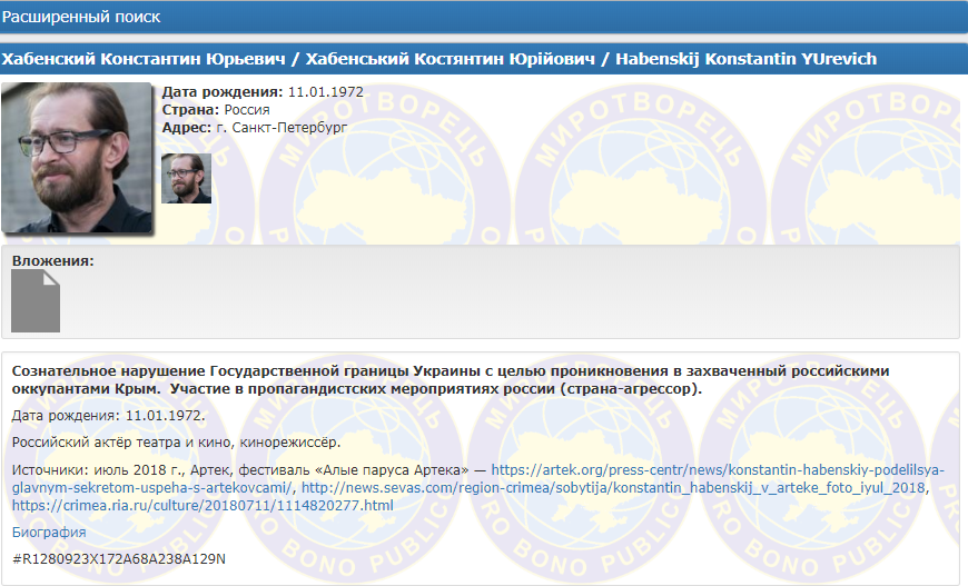 Хабенского добавили в рубрику "криминал" 14 июля с формулировкой "Сознательное нарушение государственной границы Украины с целью проникновения в захваченный российскими оккупантами Крым. Участие в пропагандистских мероприятиях России (страна-агрессор)".