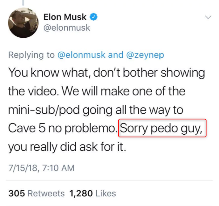 В ответ Маск опубликовал в Twitter гневное послание, в котором почему-то назвал Уонсорта "педофилом". Глава SpaceX заявил, что никогда не видел "этого британского экспата в пещере", и попросил "показать видео спасения" школьников.