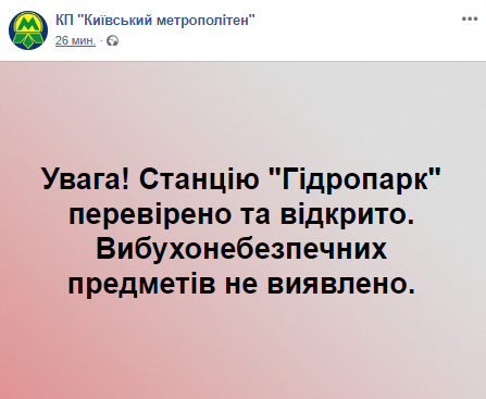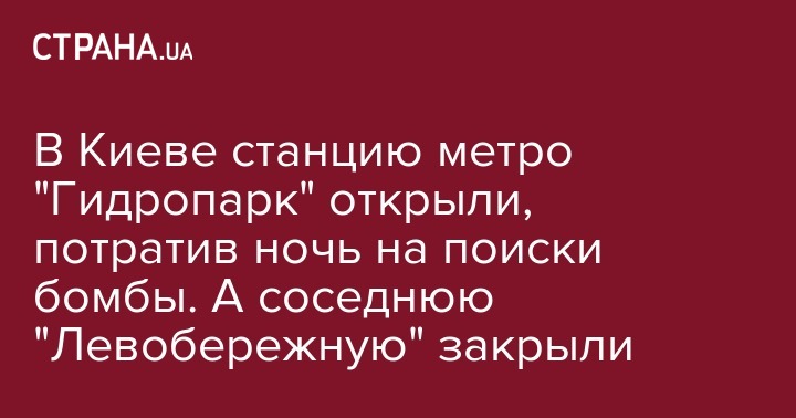 Также появилась информация о закрытии станции метро "Левобережная"(соседняя с "Гидропарком"). Около 8.30 поступил анонимный звонок о минировании. Проводится проверка. Об этом сообщает "Киев Оперативный".