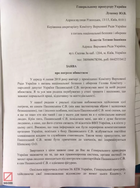 "У нашей семьи есть реальные основания опасаться осуществления этой угрозы как самим Пашинским, так и другими лицами, поскольку Пашинский С.В. мне сказал, что я еще не знаю, кто он такой и что у него для таких, как я, есть "специально обученные люди". Кроме того, Пашинский С.В. сообщил мне, что он очень богатый человек, а именно, что его состояние составляет 10% ВВП Украины, а я никто в этом мире", - написала Блистив.