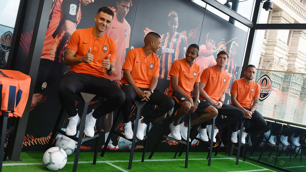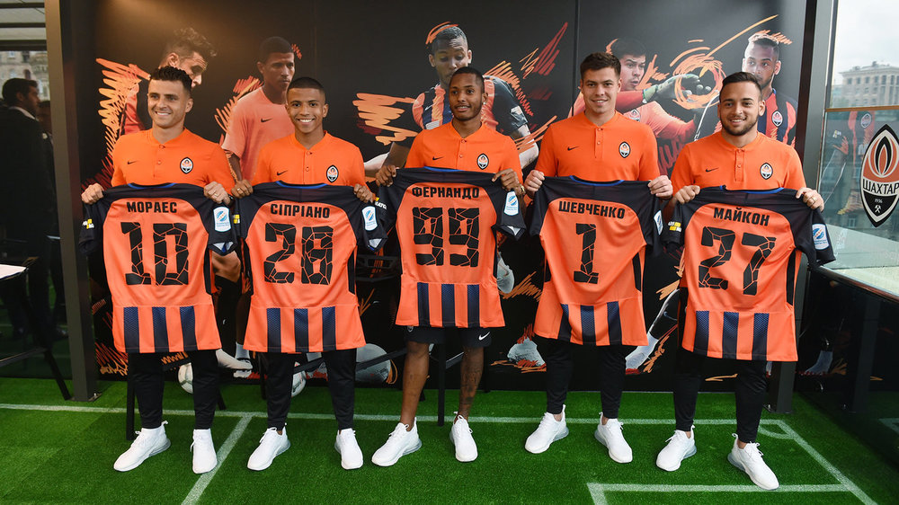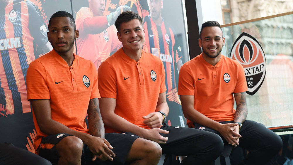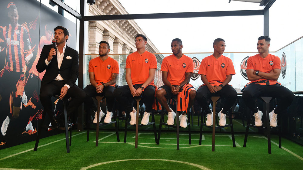 На террасе столичного ЦУМа донецкий "Шахтёр" представил пятерку новых футболистов, которые перешли в состав чемпионов Украины в летнее межсезонье.