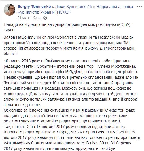 Отмечается, что главным инструментом запугивания СМИ является поджог имущества: "10 июля 2018 года в Каменском неустановленные лица подожгли редакцию газеты "Событие" (главный редактор – Елена Михолажина), которая арендует помещение в офисном здании, расположенном в центре города. Нет сомнений, что этот поджог был тщательно спланирован, ведь преступление было совершено всего через 10 минут после того, как последний работник покинул помещение редакции. Учитывая, что огнем повреждено имущество редакции, на котором газета готовилась к печати в этот день, целью преступления было не только запугивание журналистов издания, но и попытка сорвать выход газеты", -  говорится в обращении.