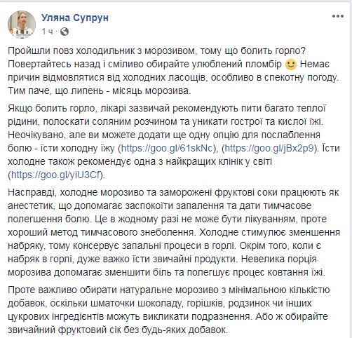 И.о. министра здравоохранения Ульяна Супрун заявила, что полезно есть мороженое, когда болит горло.