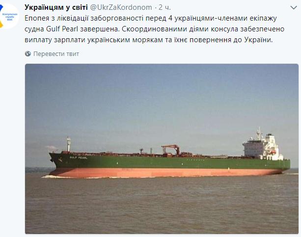 "Эпопея по ликвидации задолженности перед четырьмя украинцами членами экипажа судна "Gulf Pearl" завершена. Скоординированными действиями консула обеспечена выплата зарплаты украинским морякам и их возвращение в Украину", - отмечается в сообщении.