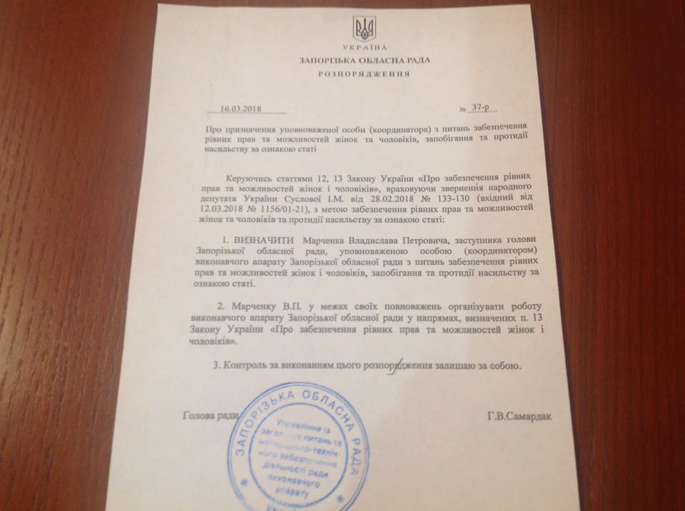 Депутат Запорожского облсовета ("Самопомощь") Владислав Марченко, который является открытым противником ЛГБТ-сообщества, назначен уполномоченным лицом по гендерным вопросам.
