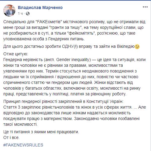 "Для этого достаточно сделать одно(!) упражнение и зайти на Википедию. Гендерное неравенство (англ. Gender inequality) — это идея и ситуация, когда женщины и мужчины не являются равными с правами, возможностями и представлениями о них. Термин касается неодинакового обращения с людьми или их восприятие / отношение к ним, полностью или частично вызванного полом или гендером этих людей. Женщины отстают от мужчин во многих областях, включая образование, возможности на рынке труда, представленность в политике, платы за равноценную работу", - цитирует Марченко.
