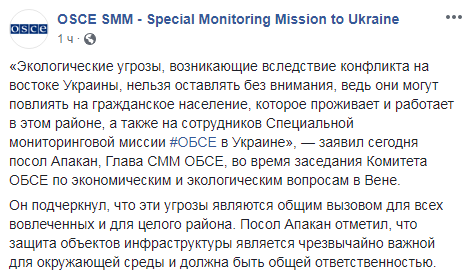 "Экологические угрозы, возникающие вследствие конфликта на востоке Украины, нельзя оставлять без внимания, ведь они могут повлиять на гражданское население, которое проживает и работает в этом районе, а также на сотрудников Специальной мониторинговой миссии ОБСЕ в Украине", - заявил посол Апакан во время заседания комитета ОБСЕ по экономическим и экологическим вопросам в Вене.