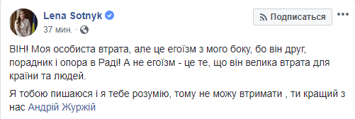 "ОН! Моя личная потеря, но это эгоизм с моей стороны, потому что он друг, советчик и опора в Раде! А не эгоизм - это то, что он большая потеря для страны и людей. Я тобой горжусь и я тебя понимаю, поэтому не могу удержать, ты лучший из нас Андрей Журжий" - эмоционально написала она, разместив заявление Журжия на имя Парубия о сложении депутатских полномочий.