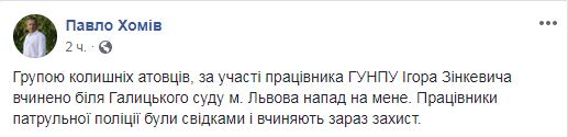 Сам пострадавший написал в Facebook, что на него напала группа бывших атошников при участии работника ГУНПУ Игоря Зинкевича возле Галицкого суда Львова. "Сотрудники патрульной полиции были свидетелями и уже защищают", - написал он.