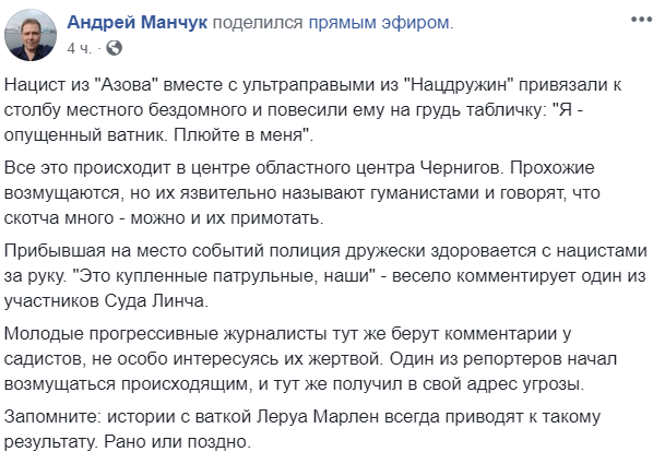 "Посмотрел видео с привязанным к столбу мужчиной в Чернигове. В центре внимания - улыбающиеся преступники в полицейской форме, непонимающие своей роли, места, функций и обязанностей и соревнующиеся с амёбой паразитирующие активисты. Одни пытают, вторые наблюдают и смеются.