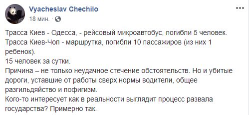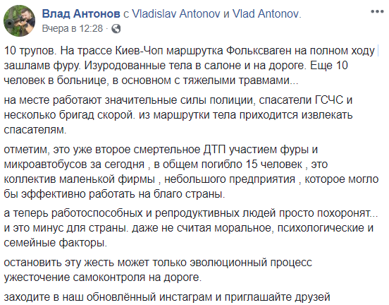 "Только вчера под Житомиром на Глыбочице было жуткое ДТП с фурой, маршруткой и 10 трупами. Я написал о бесконтрольности на дорогах и преступном бездействии дорожной полиции. Мне многие фыркали в ответ.