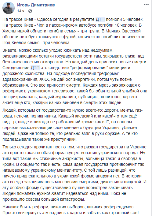 "Знаете, можно сколько угодно хихикать над недоумкам, разваливающими остатки государственности там, закрывать глаза над безнаказанностью отморозков. Но каждый день приносит новые смерти. Сегодняшние ДТП это следствие "реформирования" милиции и дорожного хозяйства. На подходе последствия "реформы" здравоохранения, ЖКХ, не дай бог энергетики, потом чуть позже образования. Это все приносит смерти. Каждая мразь заявляющая о реформах в украинском телевизоре, какой бы обаятельной улыбкой она не прикрывалась, каждый журналист, публицист, политолог, х...р его знает ещё кто, каждый из них виновен в смерти этих людей".
