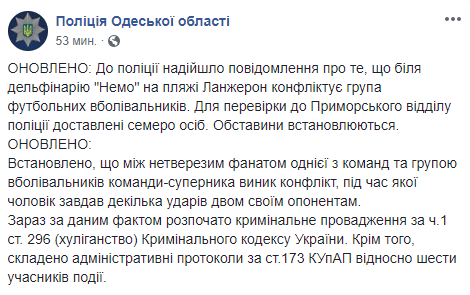 В субботу, 21 июля, в Одессе футбольные болельщики подрались у дельфинария "Немо", 7 человек были доставлены в отдел полиции.  Об этом сообщает пресс-служба Нацполиции Украины в Одесской области в Facebook.