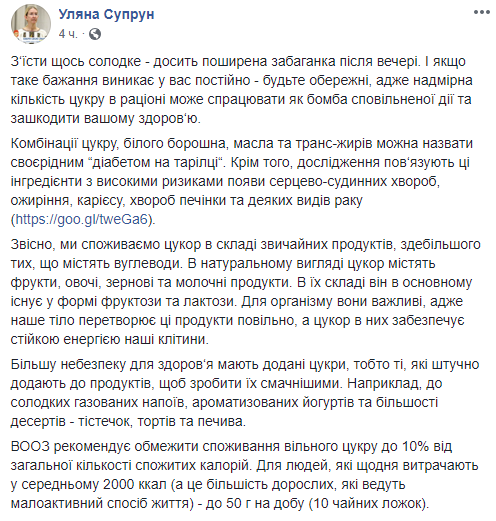 Исполняющая обязанности министра здравоохранения Ульяна Супрун рассказала, как снизить риск развития диабета, но при этом не отказываться от сладкого.