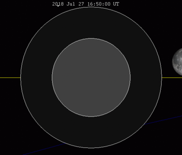 Естественному спутнику понадобится больше, чем обычно времени, чтобы выйти из тени, из-за того, что 27 июля Луна будет в апогее - на самой дальней точке своей орбиты по отношению к нашей планете.