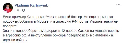"Значит, товарооборот с мордором в 12 лярдов баксов не мешает верить в агрессию рф, а выступление боксера повергло всех в смятение - а идет ли война?" - пишет пользователь Владимир Карцовник.