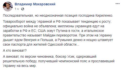 Так, политтехнолог Владимир Макаровский пишет: "Последовательная, но неоднозначная позиция господина Кириленко.