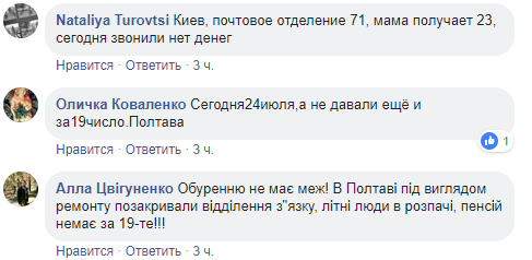 В комментариях пользователи массово жалуются на задержку пенсий в Полтаве и Киеве.