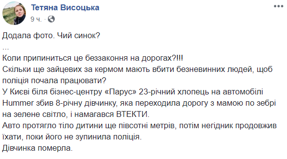 Когда прекратится этот беспредел на дорогах? Сколько еще зайцевых за рулем должны убить невинных людей, чтобы полиция начала работать?" - интересуется журналистка Татьяна Высоцкая.