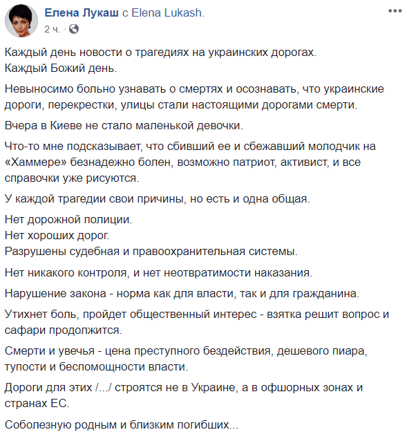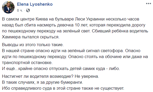 Настигнет ли водителя возмездие? Не уверена. В таких случаях я за другие бумеранги. Ибо справедливого суда в этой стране также не существует", – пишет адвокат Елена Лешенко.