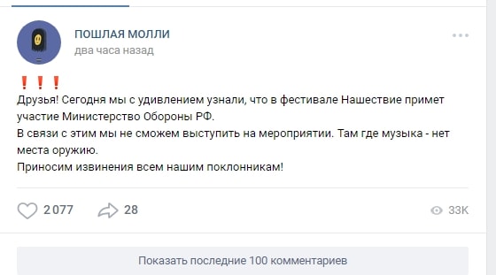 Харьковская группа "Пошлая Молли" отменила свое выступление на фестивале "Нашествие" в России. Музыканты мотивировали свое решение тем, что для них неприемлемо участвовать в "событии с милитаристским оттенком".