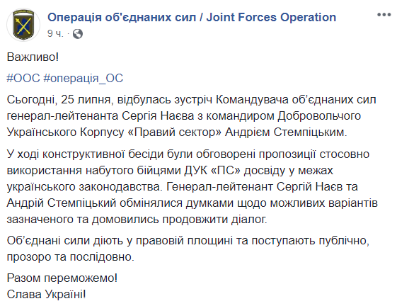 Штаб ООС отмечает, что у военного с главой ДУК ПС прошла "конструктивная беседа" о том, как использовать приобретенный бойцами подразделения опыт в рамках украинского законодательства.