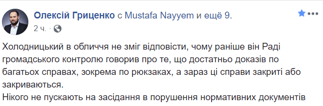 12:45 "Холодницкий в лицо не смог ответить, почему раньше он Раде общественного контроля говорил о том, что достаточно доказательств по многим делам, в частности по рюкзакам, а сейчас эти дела закрыты или закрываются. Никого не пускают на заседание в нарушение нормативных документов", - жалуется активист Алексей Гриценко.