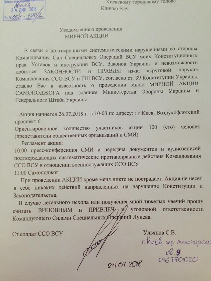 "Внимание! Солдат ССО ВСУ анонсирует самоподжег под Министерством Обороны Украины!" - написал он.