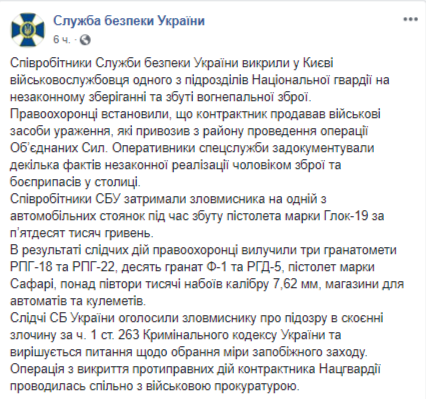 В Киеве был пойман военнослужащий Нацгвардии, который незаконно хранил и продавал оружие, привезенное из зоны операции Объединенных сил (ООС). Об этом сообщает пресс-центр СБУ в Facebook.