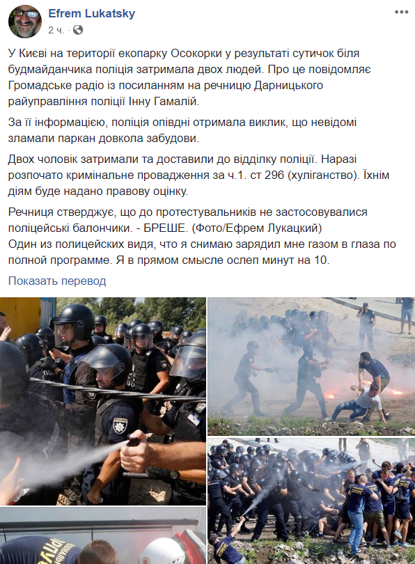 Сегодня, 28 июля, в Киеве на Осокорках произошли столкновения возле стройплощадки, на месте которой требуют возвести экопарк. Полиция задержала двух человек. Фото с места событий опубликовал украинский фотокорреспондент Ефрем Лукацкий на своей странице в Facebook.