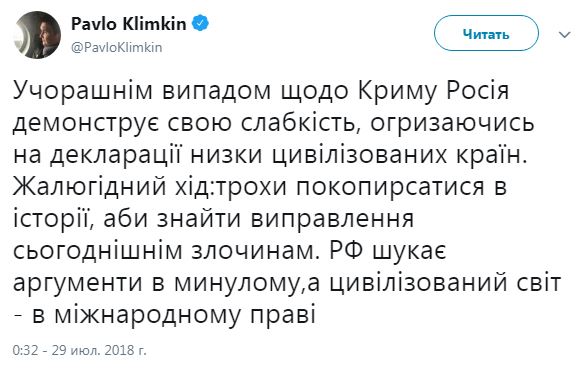 "Вчерашним выпадом по Крыму Россия демонстрирует свою слабость, огрызаясь на декларации ряда цивилизованных стран. Жалкий ход: немного покопаться в истории, чтобы найти исправление сегодняшним преступлениям. РФ ищет аргументы в прошлом, а цивилизованный мир – в международном праве", – заявил Климкин.