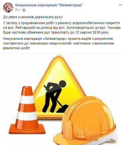 "В связи с продолжением работ по ремонту асфальтобетонного покрытия на ул. Рейтарской на участке от ул. Золотоворотской до ул. Гончара будет частично ограничено движение транспорта до 12 августа 2018 года", - говорится в сообщении.