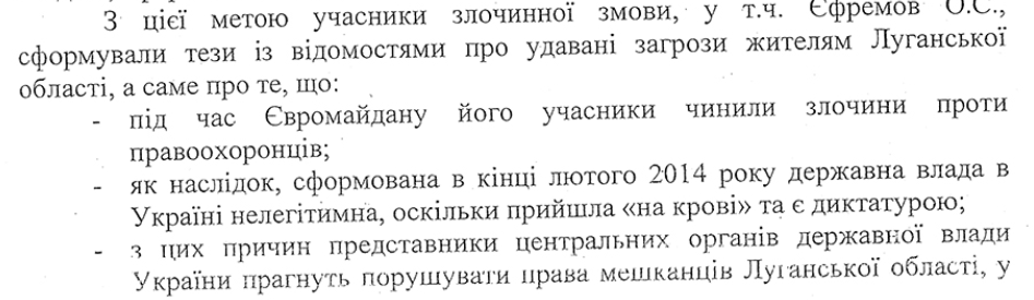 Суть обвинения в том, что Ефремов якобы подговаривал чиновников Луганской ОГА захватить ее, установив незаконную власть.